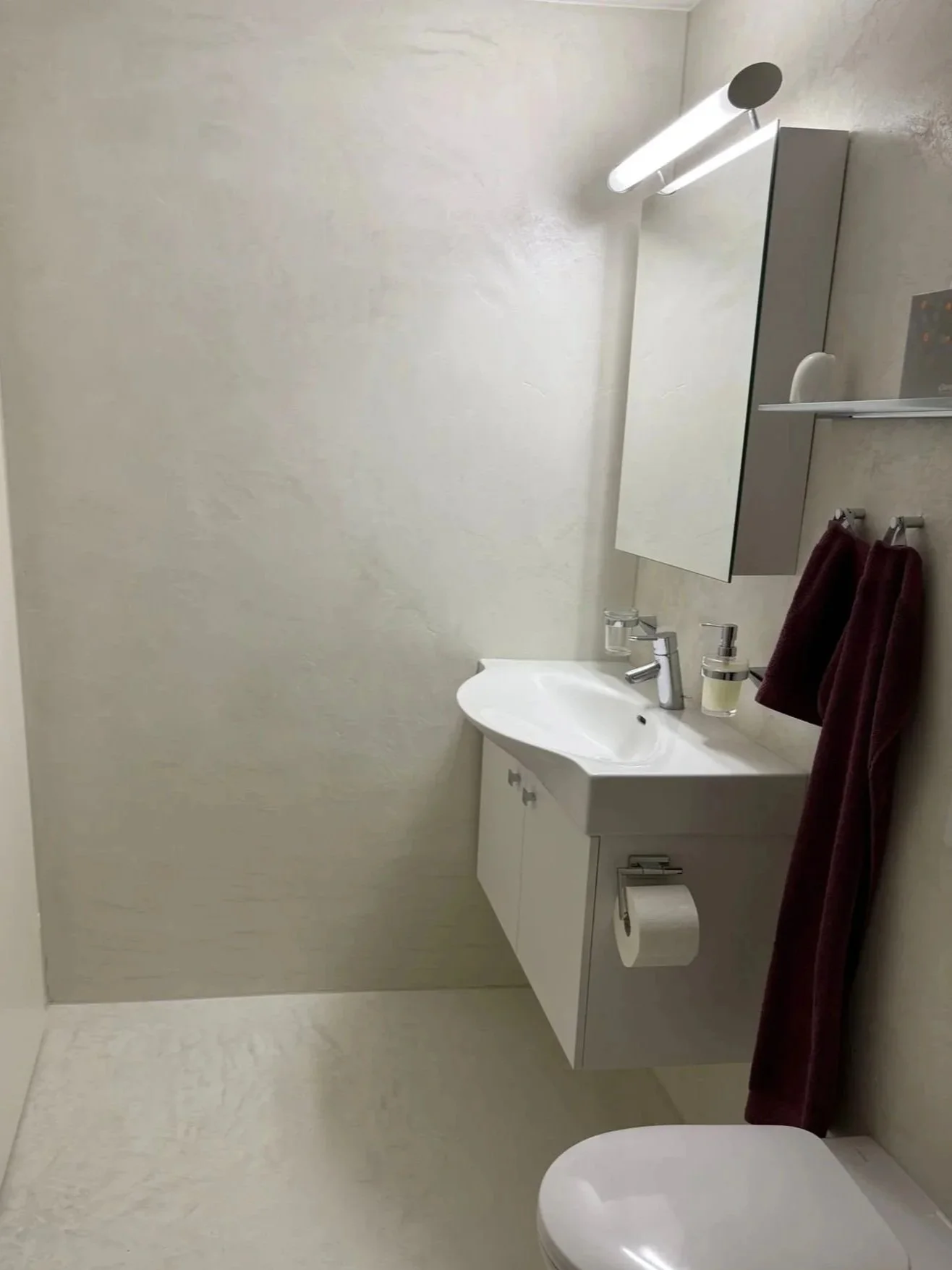 Entdecken Sie mit uns die elegante Möglichkeit, Ihr bestehendes Bad ohne aufwändige Renovation zu verwandeln. Unsere hochwertige Microzement-Beschichtung eignet sich ideal für bereits geflieste Badezimmer sowie für Wände und Böden. Das Ergebnis: eine moderne, fugenlose Oberfläche, die nicht nur ästhetisch überzeugt, sondern auch langlebig, wasserbeständig und leicht zu reinigen ist.
